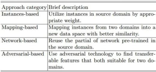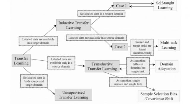 前者假设数据具有内在的聚类结构,因此,落入同一个聚类的样本类别相同。后者假设数据分布在一个流形上,在流形上相近的样本具有相似的预测结果。可见,两个假设的本质都是相似的数据输入应该有相似的输出。因此,如何更好地衡量样本点之间的相似性,如何利用这种相似性帮助模型进行预测,是半监督学习的关键。半监督学习的方法主要包括:生成式方法、基于图的方法、低密度分割法、基于分歧的方法。本文在这里对这些具体的方法不多赘述,详情请参阅周志华老师的综述文章「A brief introduction to weakly supervised learning」。迁移学习(transfer learning):迁移学习是近年来被广泛研究,风头正劲的学习范式,其内在思想是借鉴人类「举一反三」的能力,提高对数据的利用率。具体而言,迁移学习的定义为:有源域 Ds和任务 Ts;目标域 Dt 和任务 Tt,迁移学习的目标是利用源域中的知识解决目标域中的预测函数 f,条件是源域和目标域不相同或者源域中的任务和目标域中的任务不相同[2]。在迁移学习研究的早期,迁移学习被分类为「直推式迁移学习」、「归纳迁移学习」和「无监督迁移学习」。