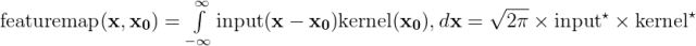 滥用符号的连续卷积定理:输入函数表示一个图像或特征映射,减去 x0 可看做是创建宽度与 x 相关的图像批,然后再乘以核(*kernel)*。最后的结果在傅里叶域中是连乘形式;这里表示一个傅立叶变换函数。对于离散「维度」(x),我们运用累加而不是积分——不过思路都是相同的。