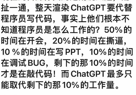 正如我所在的一个老司机群讨论说,程序员每天只有10%的时间写代码,其他时间在开会、撕逼、写PPT、改BUG...ChatGPT只取代了10%的工作量。我的一个老朋友一针见血:“如果码农这10%的东西不用干,剩下的工作自然没有了”~~我就喜欢这种现实到地板的毒鸡汤群:)