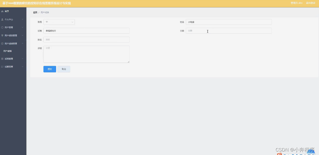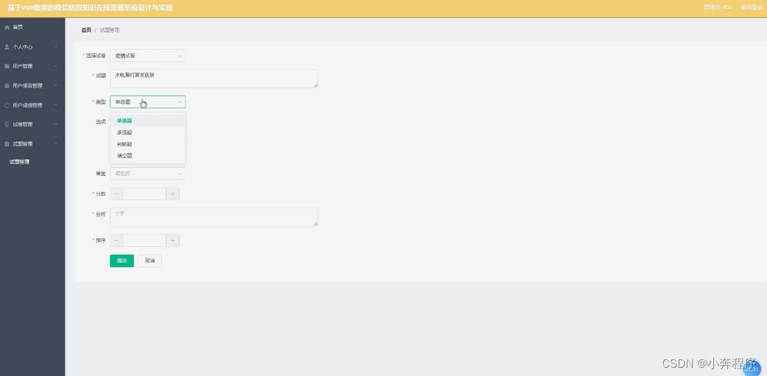 在21世纪的今天,信息技术的发展日新月异,尤其是互联网技术的广泛应用,已经深入到人们生活的各个角落。其中,Web应用作为互联网技术的重要载体,以其便捷性和高效性赢得了广大用户的喜爱。随着疫情的全球大流行,人们对疫情防控知识的了解和掌握变得尤为重要。然而,传统的知识传播方式如书籍、报纸等无法满足现代人快速获取信息的需求,因此,一个能够提供疫情防控知识并让用户进行在线答题的系统应运而生。本毕业设计题目旨在基于vue框架设计和实现一个疫情防控知识在线答题系统,以满足人们随时随地学习疫情防控知识的需求。