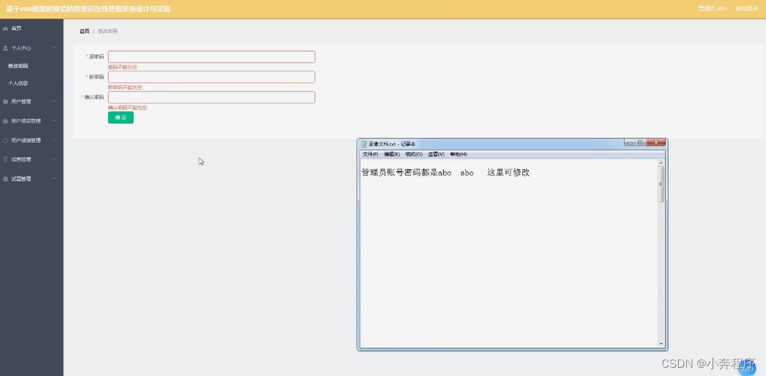 本文介绍了一个基于Vue框架和Node.js/Express开发的疫情防控知识在线答题系统,旨在提供便捷的知识学习和测试平台,通过HTML、CSS、JavaScript构建用户界面,结合MySQL5.7数据库进行数据管理,以满足现代人对快速获取信息的需求和提升公众的防疫意识。