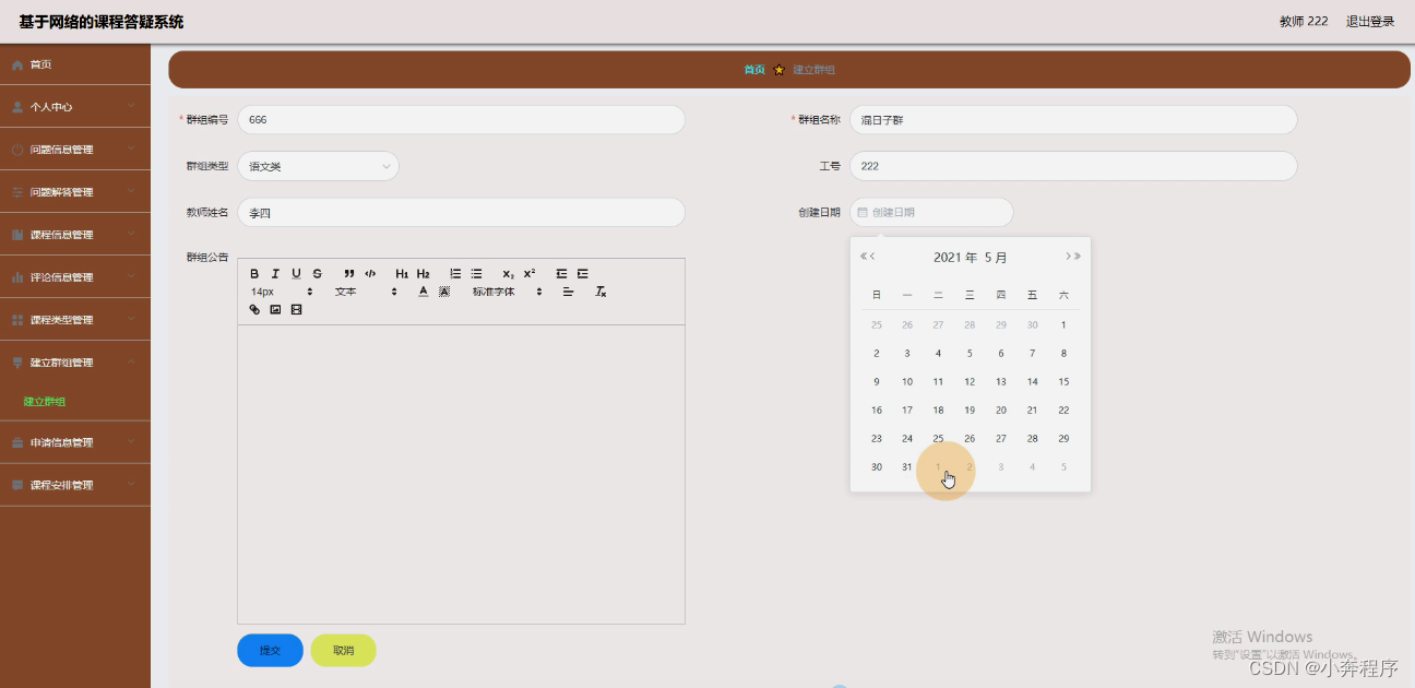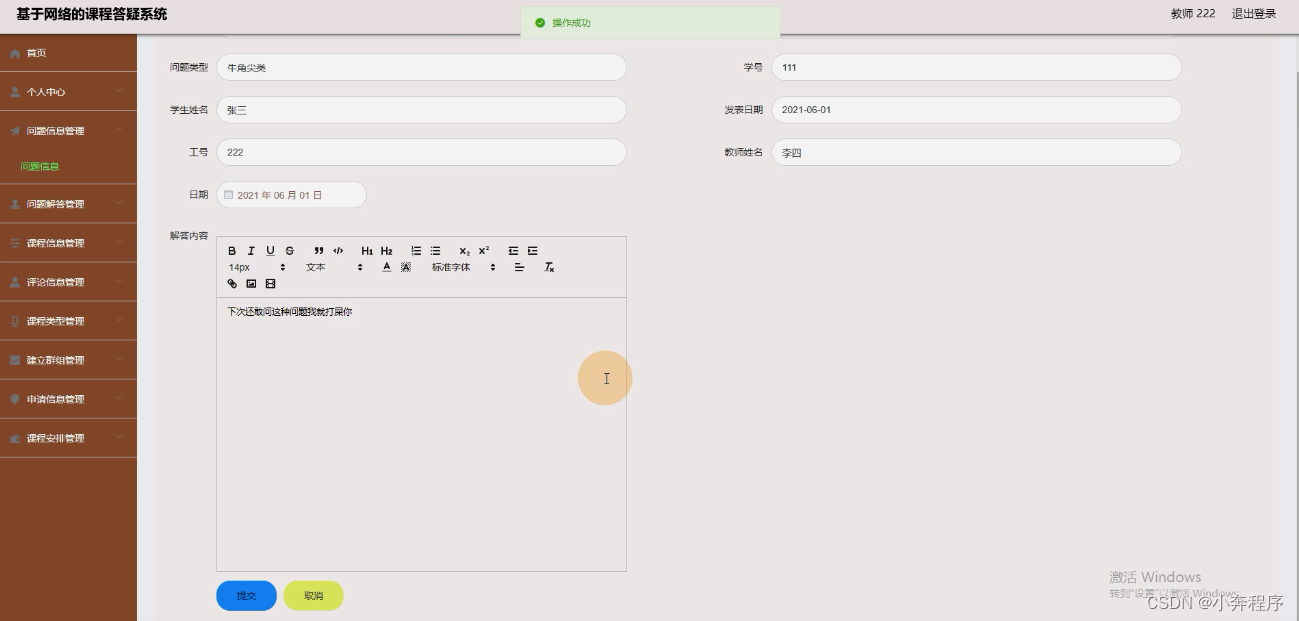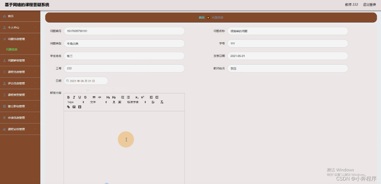 选题背景: 基于网络的课程答疑系统是一种在线学习平台,旨在提供学生与教师之间的实时互动和问题解答。随着互联网的普及和技术的不断发展,传统的教育模式已经无法满足现代社会对知识获取的需求。因此,基于网络的课程答疑系统的开发成为了一种迫切的需求。该系统通过前端技术HTML、CSS、JavaScript和Vue框架,结合后端技术Node.js和Express框架,以及MySQL数据库,实现了一个高效、便捷的在线答疑平台。学生可以通过该系统提出问题,教师可以在线回答学生的问题,实现即时互动和知识传递。这种系统的开发不仅可以提高学生的学习效率,还可以促进教育资源的共享和利用。