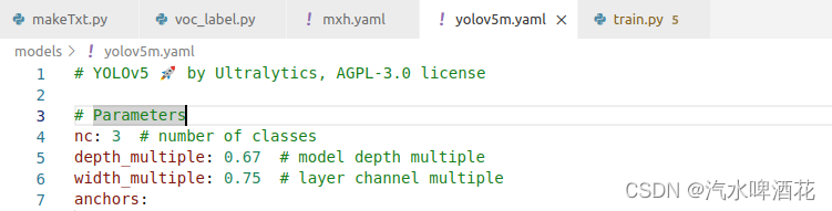 六、将models下的文件(因为我使用的是yolov5m.pt权重文件,所以我选择的是yolov5m.yaml)中的nc改成自己的种类数,我是改成3,其他的不用改动