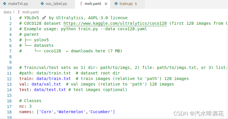 四、将data下的coco128.yaml文件复制,粘结在data目录下,改成自己的名字(如mxh.yaml)