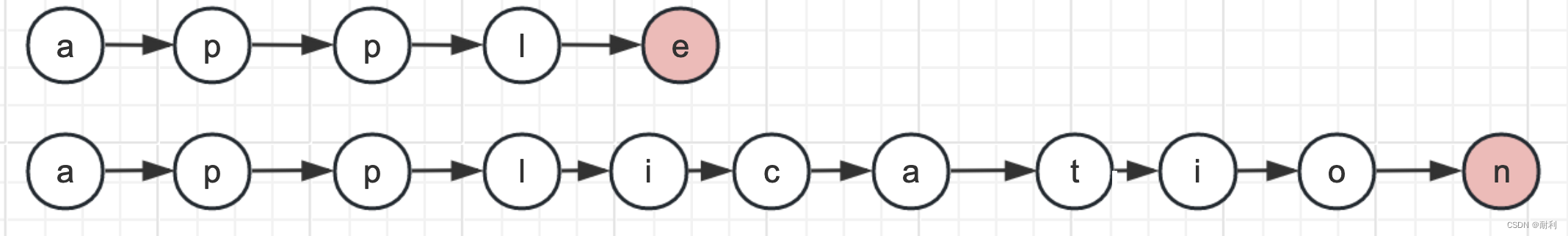 譬如第一个字符串"app", 有三个字符"a", "p", "p",易知对于第一个"a"来说,后续出现了"p", 而对于第一个"p"来说,后续出现了"p";而对于第二个"p",它是结尾字符。如果使用链表将这个字符串表示出来,并将结尾字符通过红色区分出来,则如下图所示: