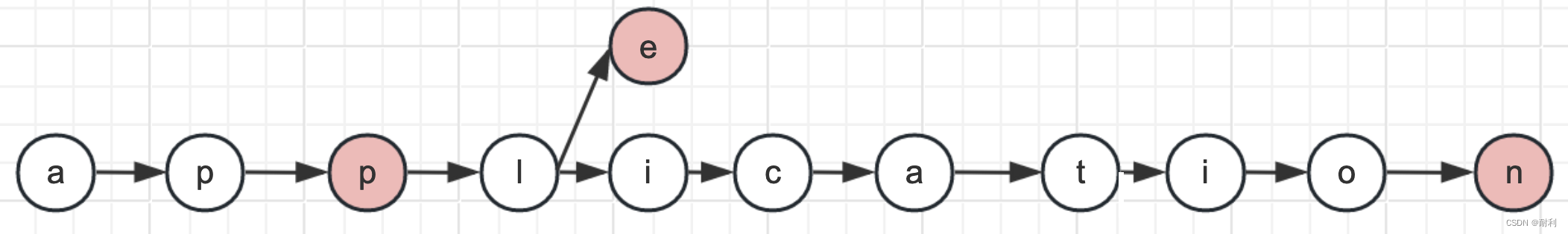 可以清楚的看到,这三个链表的前三个节点是重复的,都是a, p, p, 后两个链表的前4的节点都是重复的,都是a,p,p,l。而l之后出现了分叉,在"apple"中,l指向了e,在"application"中,l指向了i,如果我们将三个链表合并,并允许节点可以指向多个其他节点的话,图示就如下所示:
