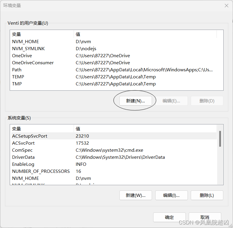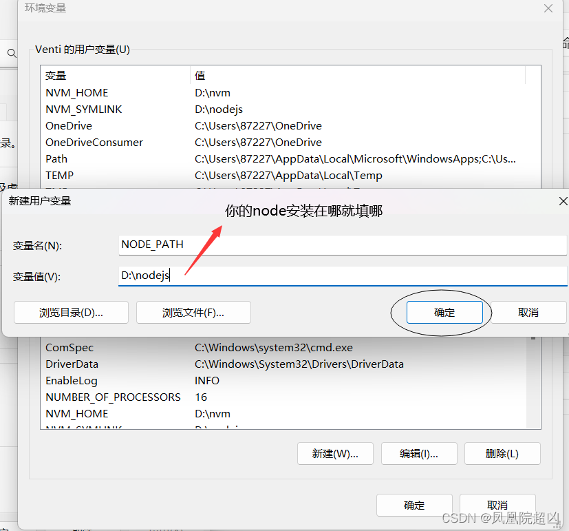 2.用户变量处点击新建。变量名:NODE_PATH ,变量值:node安装文件夹的绝对路径