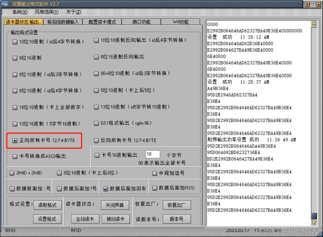 在对接门禁设备之前,需要对阅读器(门禁设备)输出格式进行设置,保证读取完整的epc数据: