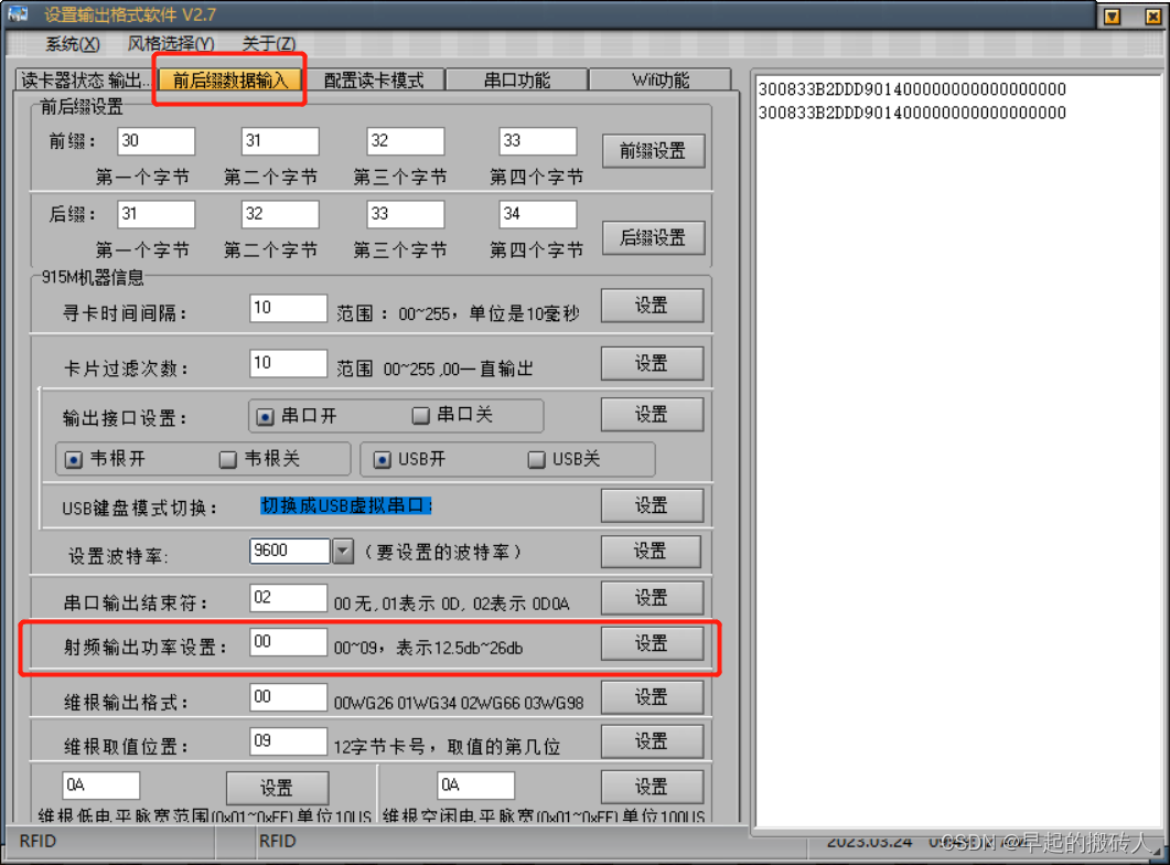 设置输出频率:00-09,数值越高,读取epc数据时越灵敏,在右侧控制台显示的epc码越不完整。