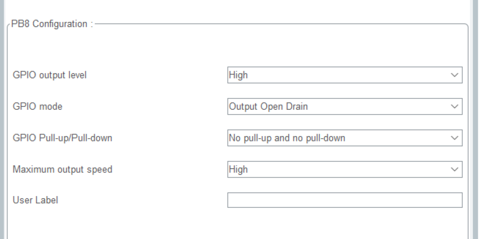 使用前要在cubemax里先配置 PB8 PB9参数如上两个都这样配置即可 配置这两个引脚的原因是江科大源码中就是这样配置的 大家想放在其它位置只许自己更改代码 cubemax重新配置即可