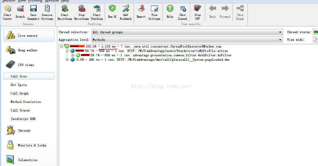 2.执行应用程序操作就可以看到该步操作在后台的耗时情况,Thread Status可以选择,区别如下(例如查询DB)
