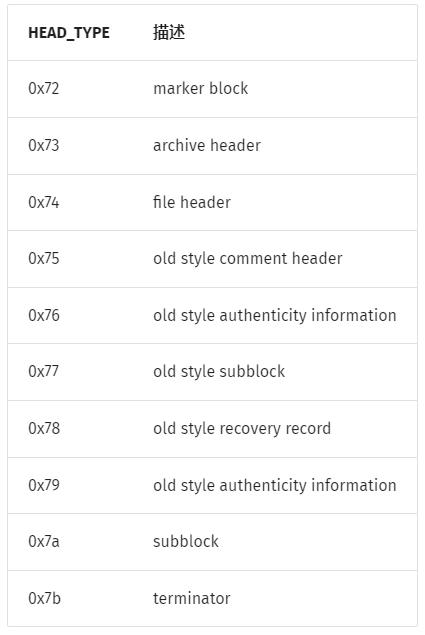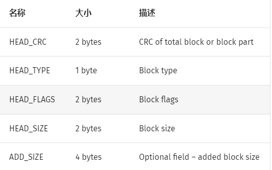 RAR 由可变长的块组成,这些块的没有固定的先后顺序,但要求第一个块必须是标志块并且其后紧跟一个归档头部块。每个块均以以下字段开头。