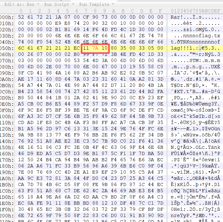 用 010 Editor 打开result.rar发现有一块的 HEAD_TYPE 是0x7a