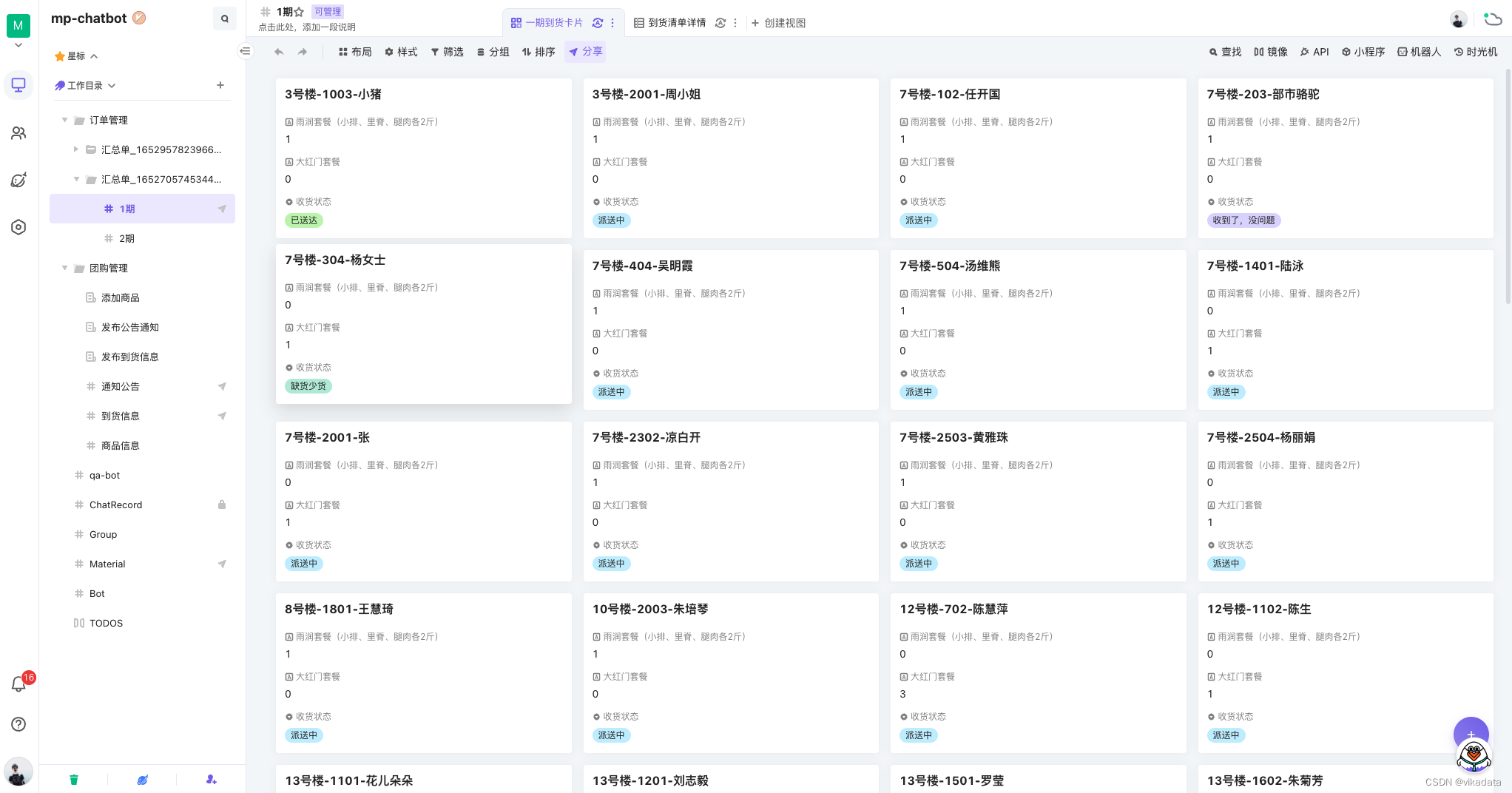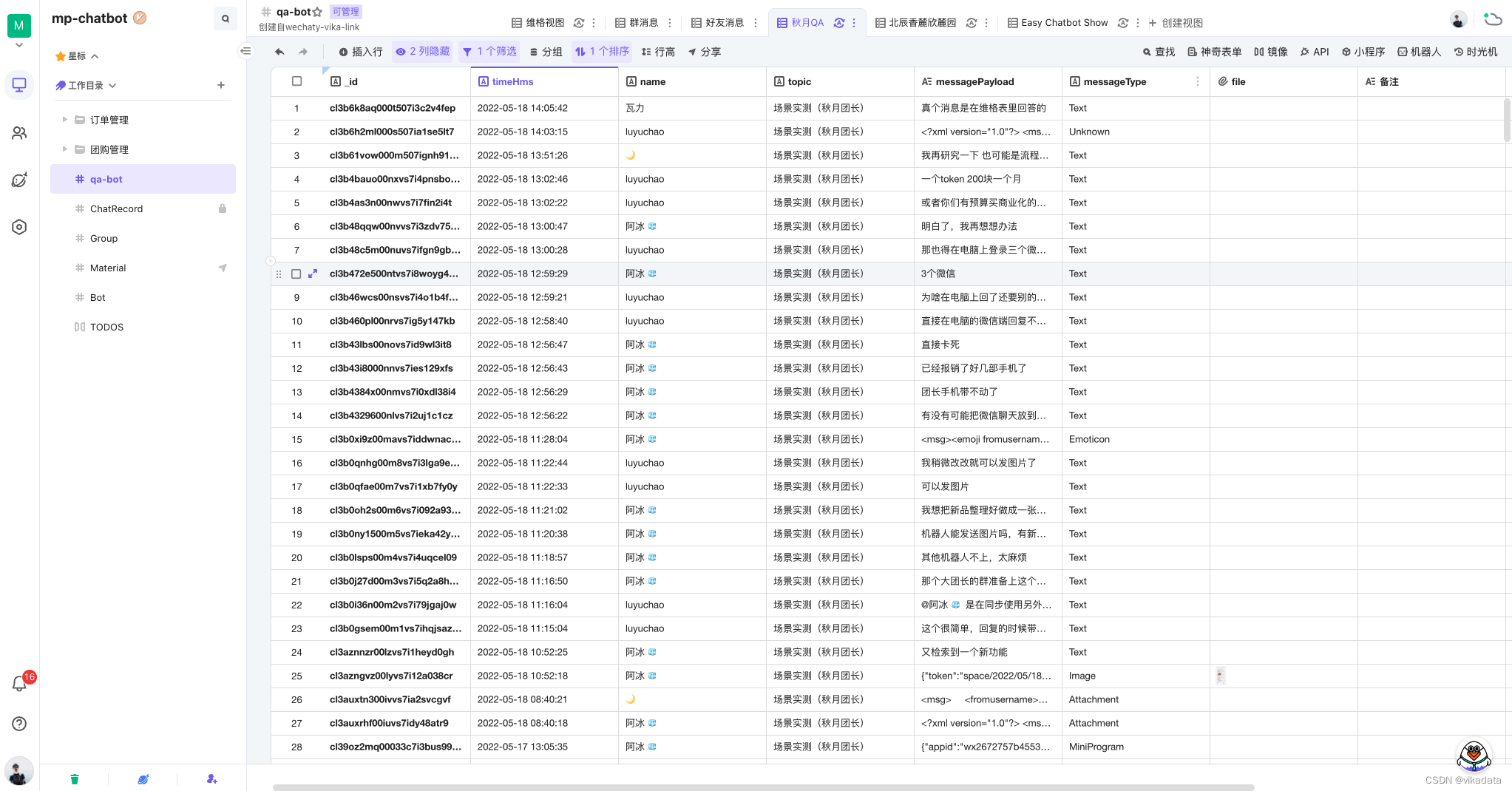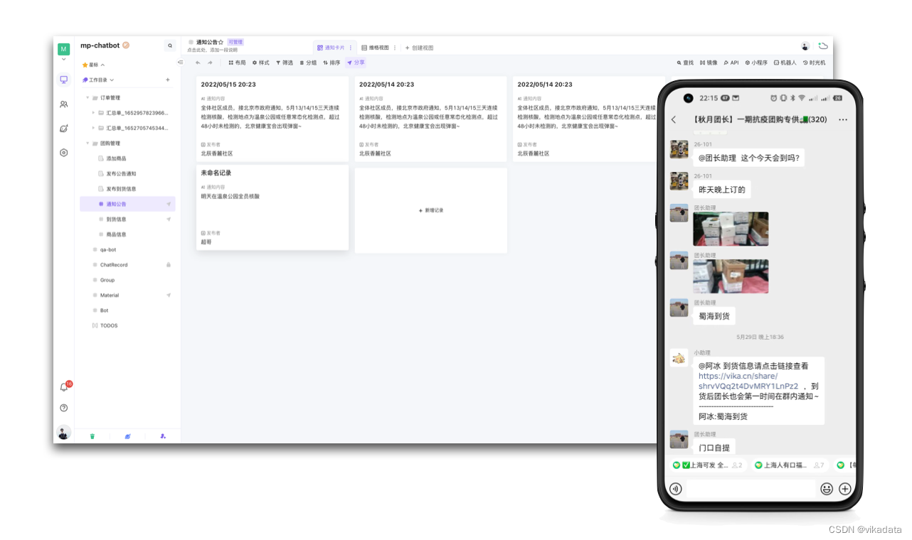 在 choogoo 的这个开源项目中,微信群中的信息通过 API 往vika维格表中写入并存储,可视化地充当后台管理信息数据。
