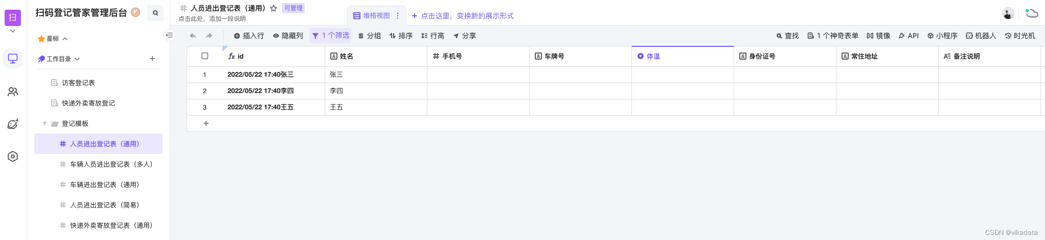 choogoo 已经倾向于用维格表去做更多互联网项目的 CMS 内容管理系统,比如正在做的「扫码登记管家」小程序。疫情期间,去到哪个小区或社区都要纸笔登记个人信息,不如扫码登记方便且易管理。