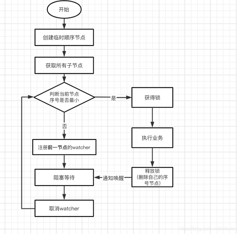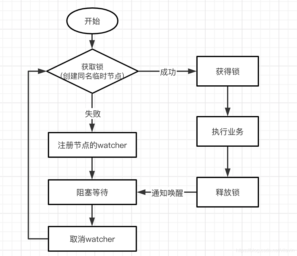 - watch监测到锁节点被删除,取消watcher继续争抢锁,重复上述步骤