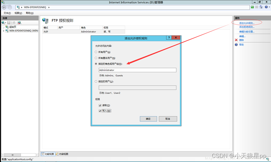 6.FTP界面选择 “FTP授权规则“—>右侧“添加允许规则”–>选择“指定的角色或用户组”,以及权限选择,“读取 写入”