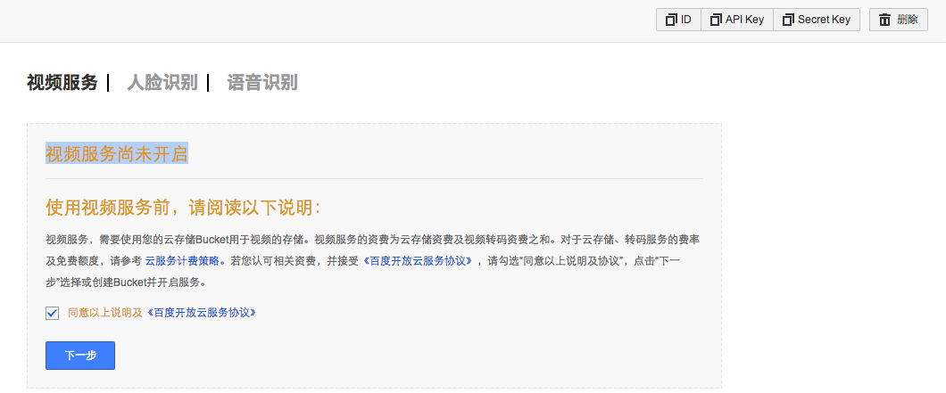1)开发者需要使用百度账号登录百度开发者中心注册成为百度开发者并创建工程,方可获取应用ID、对应的API key(即:ak)及 Secret Key(即:sk)等信息。因为需要播放直播流,所以需要开启视频服务才能使用(见下图)