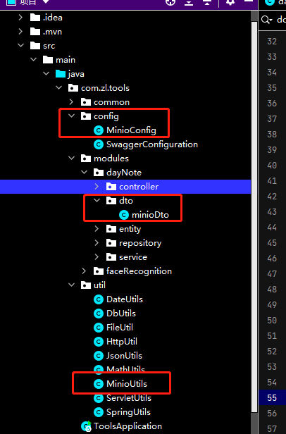 java项目结构如下:增加minioConfig配置,服务连接使用minioDto(包含endpoint,accesskey,serectkey)