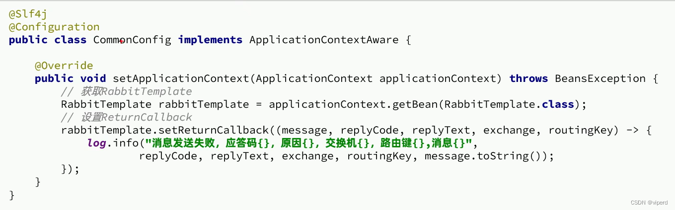 2. 每个RabbitTemplate之内配置一个ReturnCallback,因此需要再项目启动过程中配置: