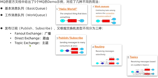 RabbitMQ官方提供了5个不同的Demo示例,对应了不同的消息模型: