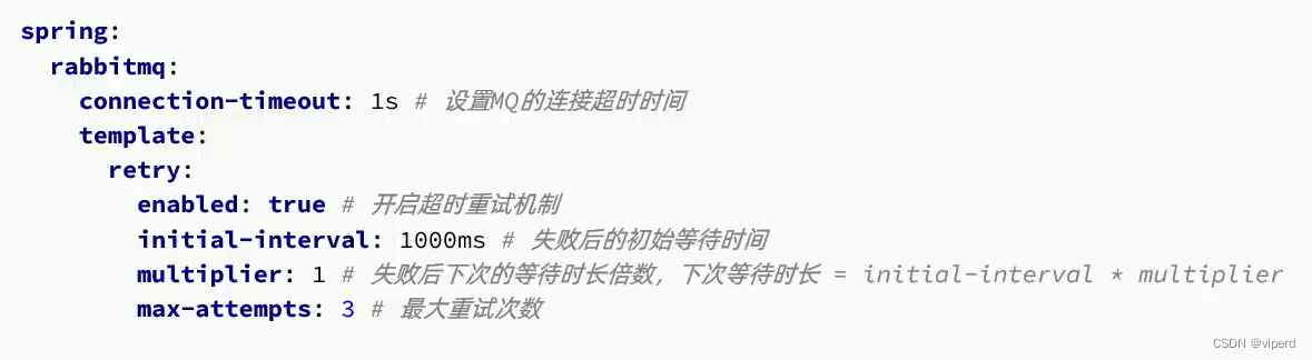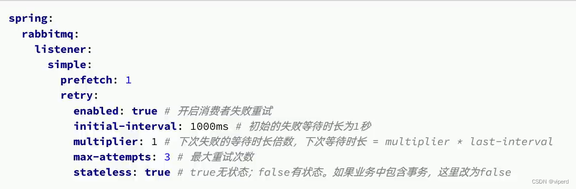 我们可以使用Spring的retry机制,在消费者出现异常时利用本地重试,而不是无限的重新入队: