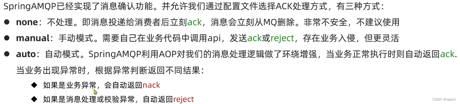 - 开启消费者确认机制为auto,由spring确认消息处理成功返回ack,异常返回nack