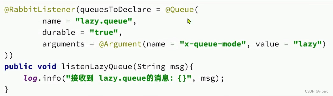 要设置一个队列为惰性队列,只需要在声明队列时,指定 x-queue-mode属性为lazy即可: