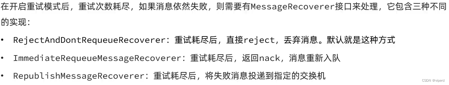 - nack : 消息处理失败,RabbitMQ会再次投递消息,直到成功