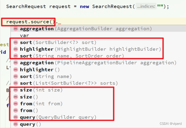 这里关键的API有两个,一个是request.source(),其中包含了查询、排序、分页、高亮等所有功能: