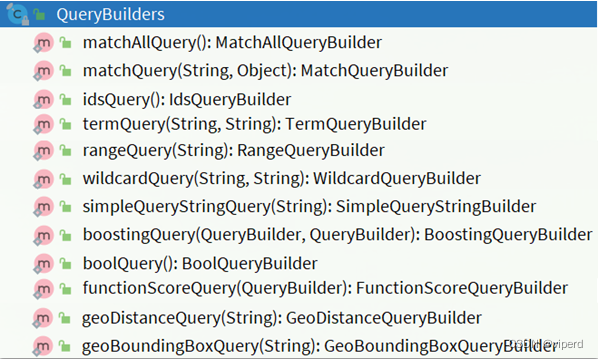 另一个是QueryBuilders,其中包含match、term、function_score、bool等各种查询: