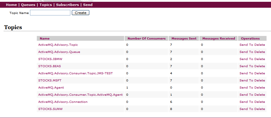 点击demo应用中的“ Market data publisher”,就会发一些测试的消息。转到admin页面的topics menu下面(queue和topic的区别见 http://andyao.iteye.com/blog/153173),可以看到消息在增长。