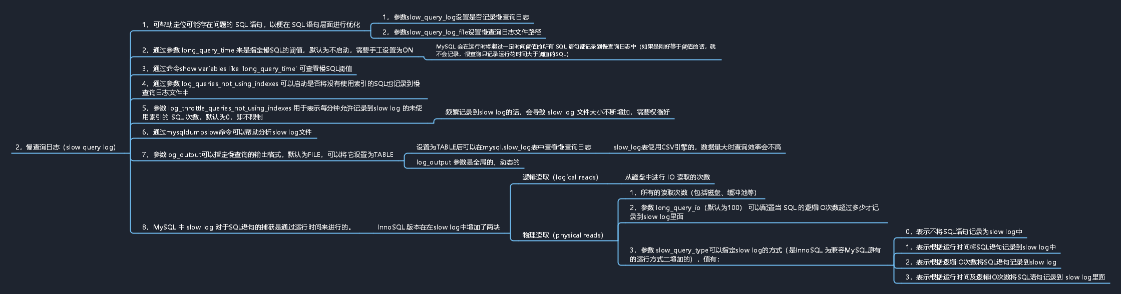 - 2,表示根据逻辑IO次数将SQL语句记录到slow log