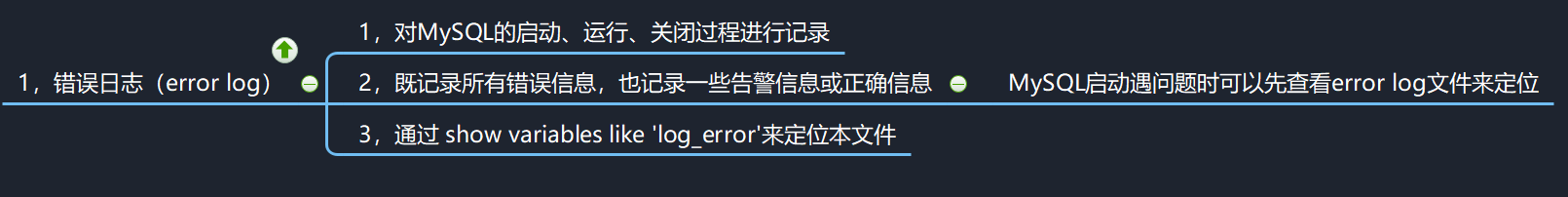 错误日志文件会对整个MySQL启动、运行以及关闭的过程进行记录,除了记录错误信息以外,还会记录一些告警信息和正确的信息。当在启动MySQL的时候如果遇到错误,首先可以查看错误日志。