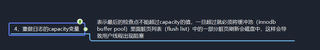 重做日志的capacity变量表示最后的检查点不能超过capacity的值,一旦超过就必须将缓冲池(innodb buffer pool)里面脏页列表(flush list)中的一部分脏页刷新会磁盘中,这样会导致用户线程出现阻塞。