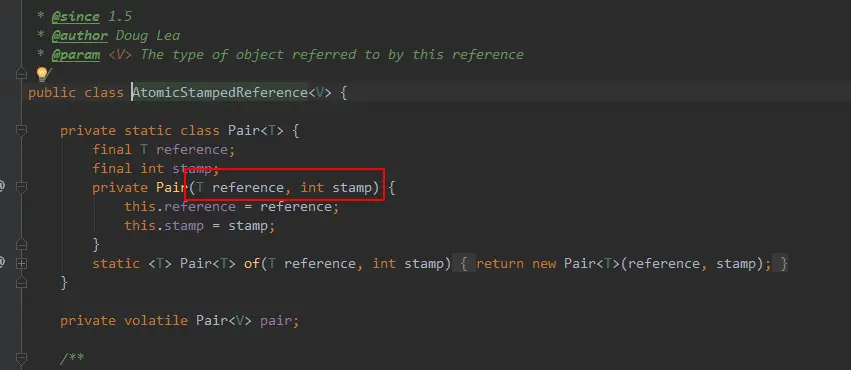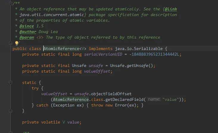 (3)只能保证一个共享变量的原子操作:当只有一个共享变量进行CAS操作的时候,就可以进行自旋的CAS去进行原子操作,但是对多个共享变量进行CAS操作的时候,循环CAS无法保证原子性(可以在脑海里面想一下如果一个CAS同时保证x++和y++是什么情况),这时候我们可以取巧将这两个变量放在一个对象里面,因为这时候锁定的就直接锁定了一个对象的缓存行(段),那么就可以完整的对这个对象及其引用做一个原子操作。java提供的AtomicReference类可以用来保证对象之间的原子性(大致的原理还不了解,但大概是将所有引用对象的缓存段都进行缓存锁或者总线锁来处理),看看源代码和注释: