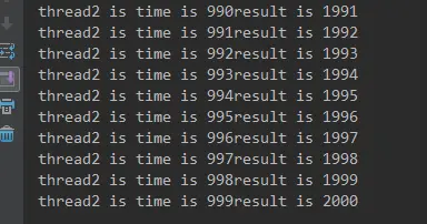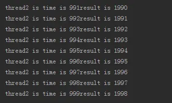 System.out.println("thread2 is " + "time is " + i + "result is " + x);