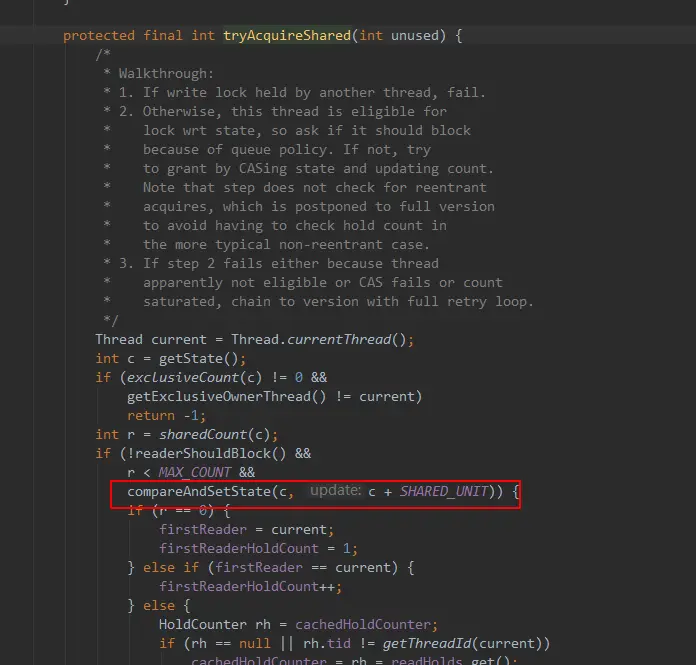 可以看到ReentrantReadWriteLock会先去获取锁的count,然后在小于MAX_COUNT锁数目的时候,再去用cas设置锁的状态,然后再去获取锁。