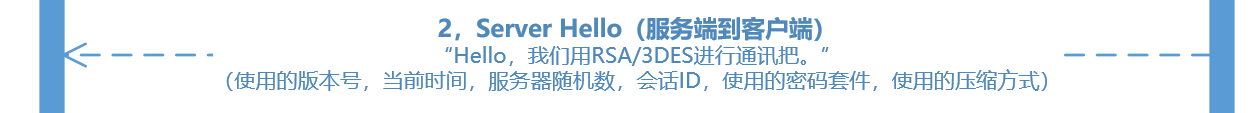 只要服务端有正确受到客户端的请求,经过处理后,这时会返回“Hello,我们用RSA/3DES进行通讯吧”。也就会将本次握手所采用的密码套件、压缩方式等等返回给客户端。