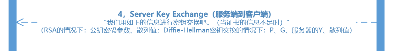 如果证书方面的信息不足够时,会无法对通讯进行加密。这时就需要服务端和客户端互相提供一些信息进行密钥的交换。例如在使用RSA的话,服务端会发送公钥密码参数以及散列值等给客户端。如果是使用Diffie-Hellman密钥交换的话,则需要提供P,G,服务器的Y以及散列值。关于Diffie-Hellman算法大家可以自行查找相关资料学习,这里就不展开讨论。