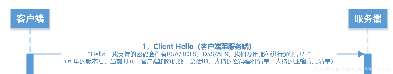 客户端:“Hello,我支持的密码套件有RSA/3DES、DSS/AES,我们要用那种进行通讯呢?”。并附上了客户端可用的版本号,当前时间,客户端的随机数,会话ID,支持的密码套件清单,支持的压缩方式清单这些信息。这时服务端就能根据客户端请求中的信息进行相应的处理,并返回响应。