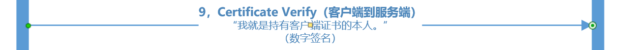 如果服务器有发送Certificate Request,则客户端就需要返送Certificate Verify消息给服务端。这一步中客户端先计算“主密码”和“握手协议中传送的消息”的散列值,然后会用客户端证书的私钥对其进行签名,服务端在受到签名后会使用客户端证书的公钥对其进行验签。这一步是客户端为了证明自己确确实实是拥有客户端证书的私钥的。拥有证书的私钥才能证明你是拥有该证书的。