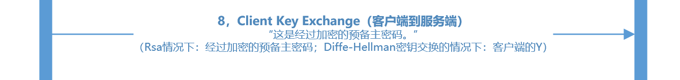 此阶段中,客户端会向服务端发送Client Key Exchange消息,如果采用的是Rsa的话,其中会包含“经过加密的预备主密码”。如果是Diffe-Hellman,则包含的是Diffe-Hellman的公开值。所谓预备主密码,其实就是客户端生成的随机数,这个随机数在之后会被用于生成主密码的种子。客户端和服务端使用相同预备主密码能计算出相同的主密码。有主密码就能对应地生成对称密码的密钥、消息认证码的密钥以及采用CBC模式的对称密码所使用的出事向量。预备主密码在传输前会使用服务器的公钥(回想一下服务器的公钥是在哪一步中获得的?)进行加密。