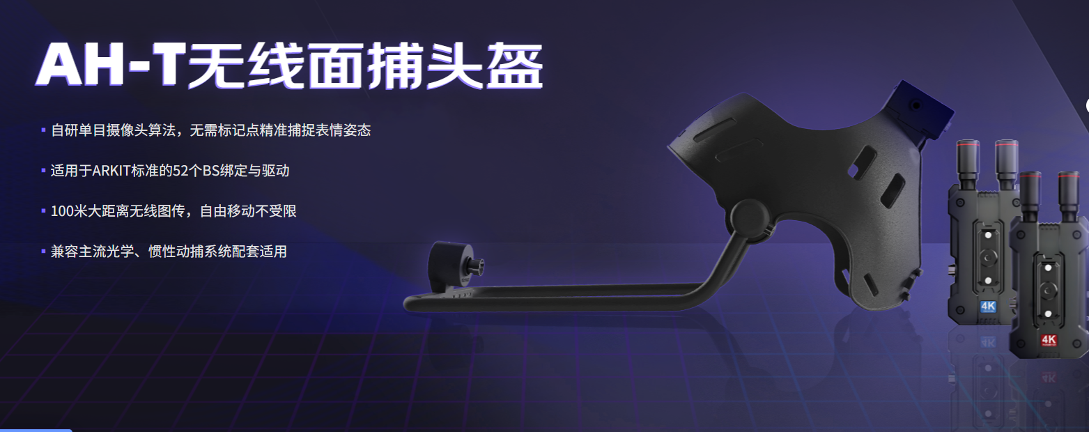该款头盔采用无线图传技术,在精细捕捉表情的前提下,无需使用连接线即可进行捕捉,使用者通过佩戴该款头盔可以进行大范围的自由移动,进行复杂的舞蹈、武术表演,大大的增强直播效果。此外还可以适配光学动捕与视觉捕捉系统,例如在搭配无穿戴动作捕捉系统的情况下,真人只需佩戴AH-T表情捕捉头盔,即可进行真人“身体+表情”的360°捕捉,赋予用户更加舒适、自由的使用感受。