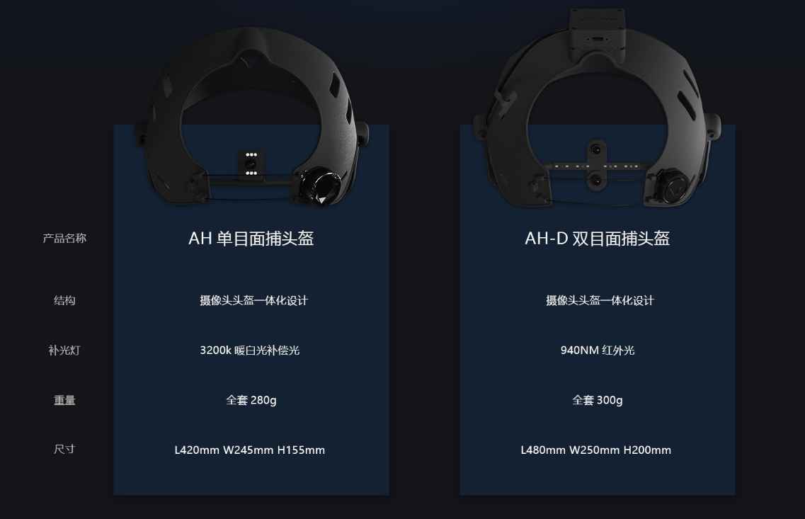其中基于面部摄像头数量不同,可以分为单目面捕头盔/双目面捕头盔,采用螺旋式纽扣设计,可以根据佩戴人头型大小进行调节,其中双目面捕采用红外光补偿灯设计,可以在各种自然光线下进行精准的面部表情捕捉,拓宽了设备的使用场景,可搭配动捕设备进行多场景的3D虚拟人直播驱动。
