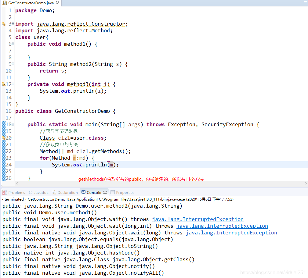 public Method[] getMethods():获取包括自身和继承过来的所有public方法