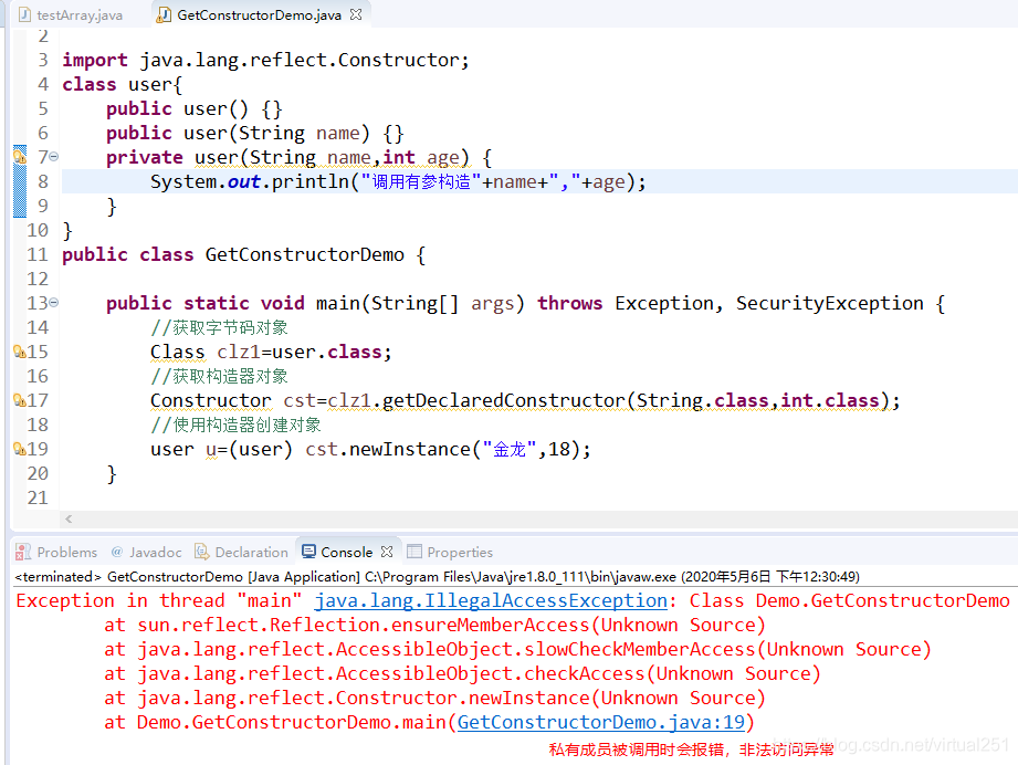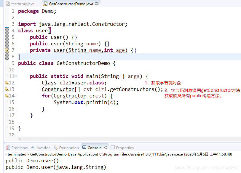 public Constructor<?>[] getDeclaredConstructors():获取当前类的所有构造器,与访问权限无关