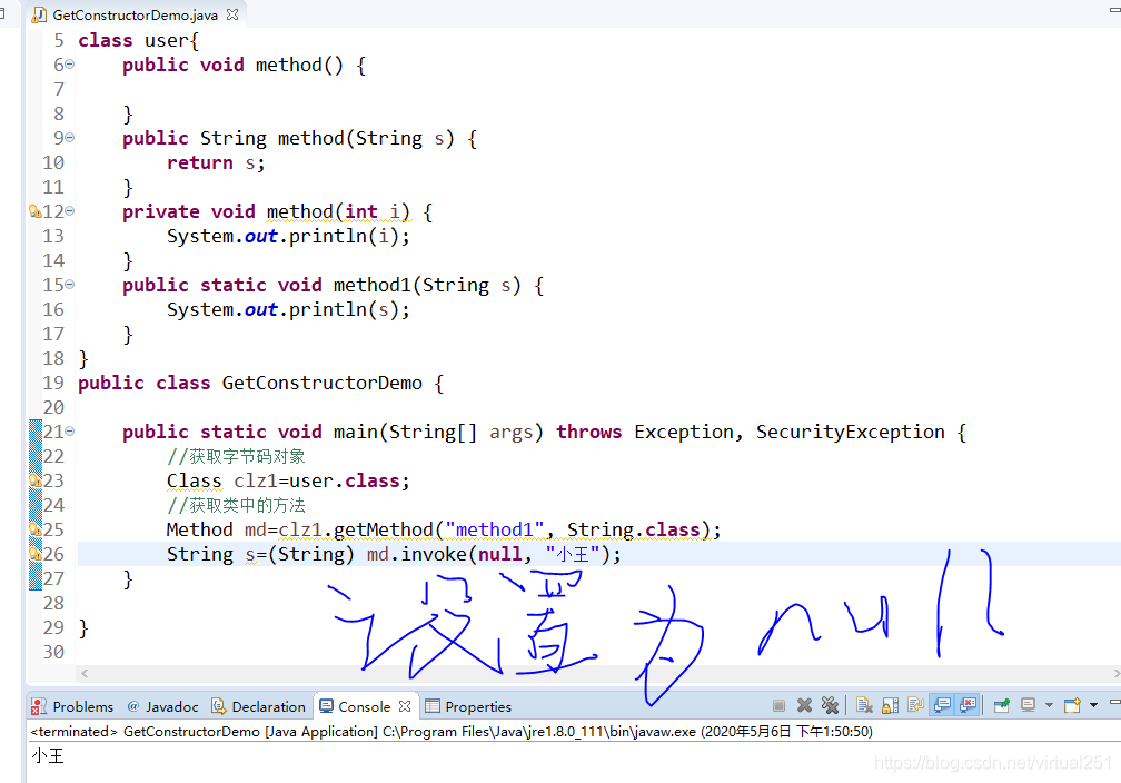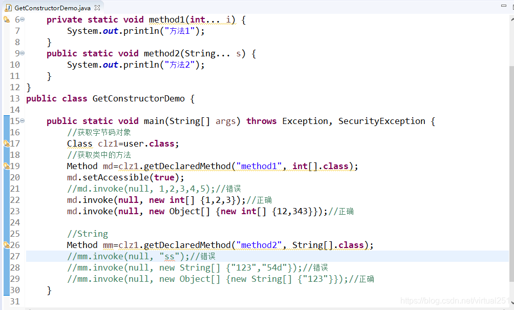 public Object invoke(Object obj,Object...args):表示调用当前Method所表示的方法