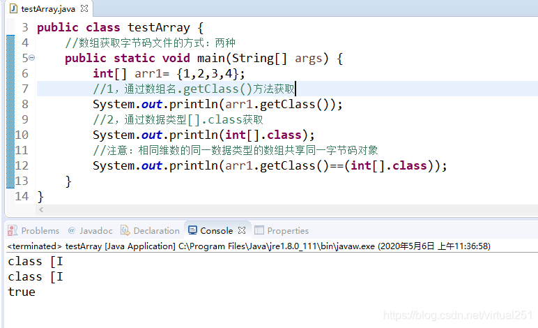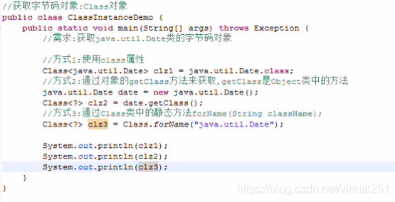 注意:同一个类在JVM中只存在一份字节码对象,也就是说clz1==clz2==clz3