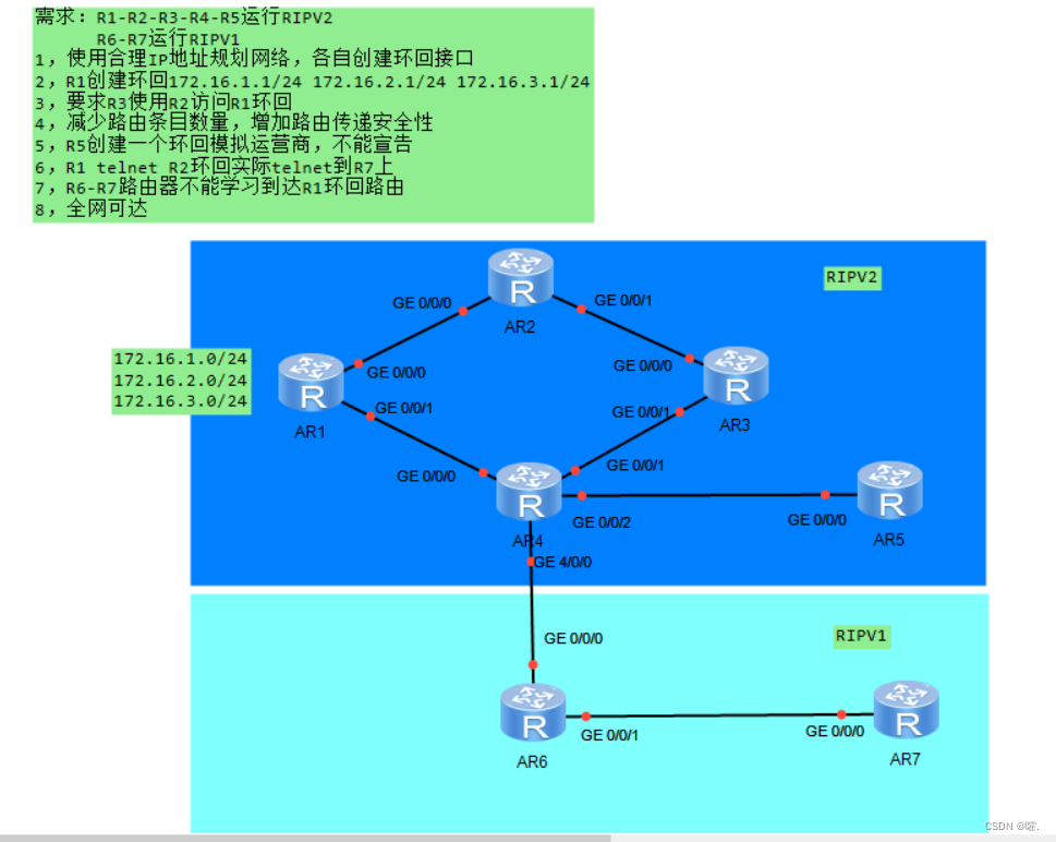 3.R1-R5运行RIP2,R6-R7运行RIP2